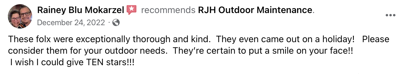 At RJH Outdoor Maintenance, your satisfaction is our top priority. We take the time to listen to your goals and preferences, working closely with you throughout the process to ensure the final result exceeds your expectations.